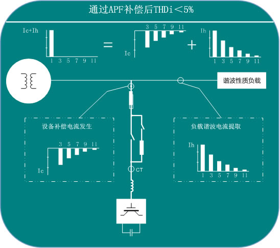-APF有源電力濾波器通過外部電流互感器實(shí)時(shí)檢測(cè)負(fù)載電流,通過DSP計(jì)算提取,分解出負(fù)載的諧波電流分量,并通過PWM信號(hào)驅(qū)動(dòng)內(nèi)部IGBT,使電流變換器產(chǎn)生一個(gè)和負(fù)載的諧波電流大小相當(dāng)頻率相反的補(bǔ)償電流注入系統(tǒng),從而實(shí)現(xiàn)動(dòng)態(tài)濾波。